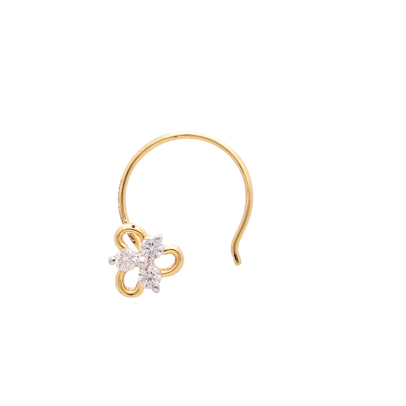one yellow gold nosepin, partly rhodium plated, weighing in total 0.24g., containing three (3) natural diamond